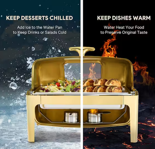 6.3 qt. Gold Stainless Steel Rectangular Chafing Dish for Buffet with Glass Window Full Size Food Pan