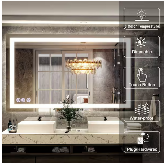 30 in. W x 55 in. H LED Light Anti-Fog Rectangular Modern Frameless White Wall Mirror