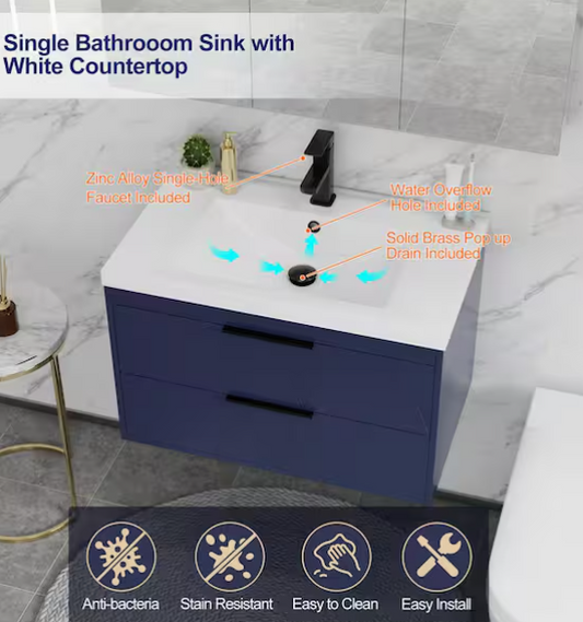 30 in. W x 18.1 in. D x 18.1 in. H Single Sink Floating Blue Bath Vanity with White Resin Top and Drain Faucet Set