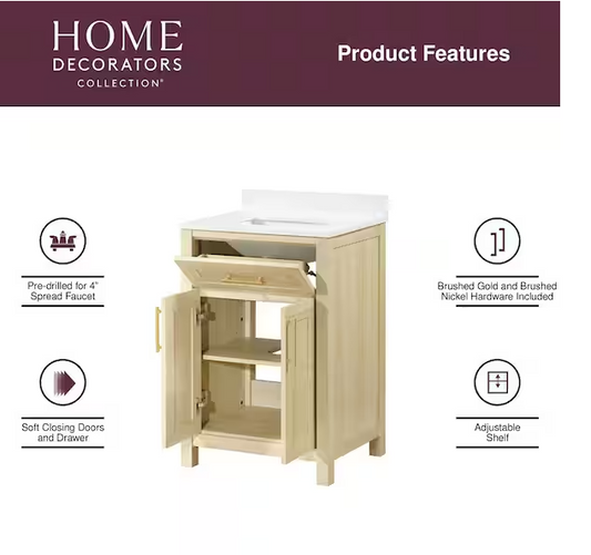 Beaufort 24 in. Single Sink Light Birch Bath Vanity with White Engineered Stone Top (Assembled)