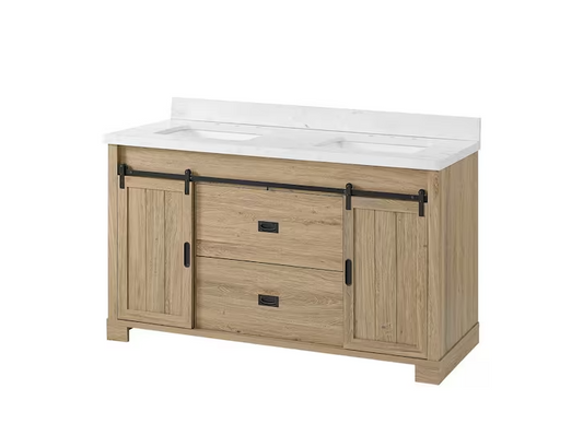 Doveton 60 in. Double Sink Freestanding Weathered Tan Bath Vanity with White Engineered Marble Top (Assembled)
