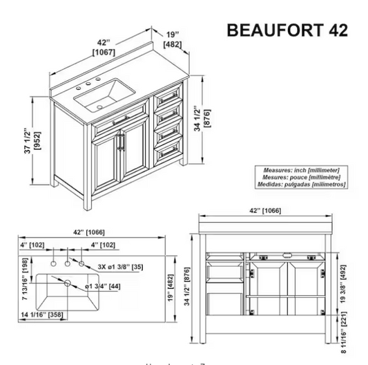 Beaufort 42 in. Single Sink Black Bath Vanity with White Engineered Stone Top (Assembled)