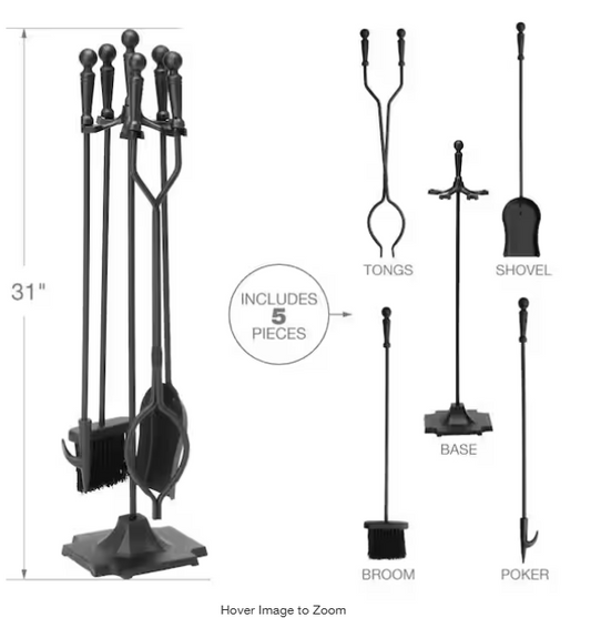 Black Cast Iron 5-Piece Fireplace Tool Set with Ball Handles