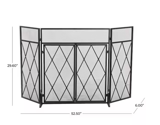 Black Metal Geometric Diamond 3-Panel 2 Door Fireplace Screen with Mesh Backing