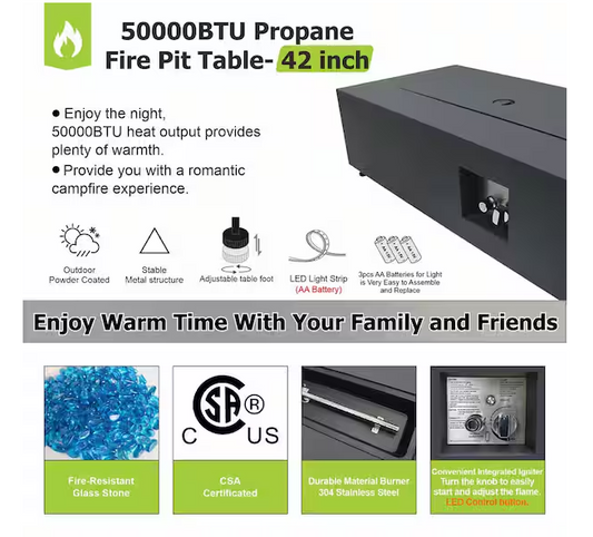 42 in. Propane Fire Pit Table, Gas Fire Pit Table with RGB LED Light, Lid and Blue Stone