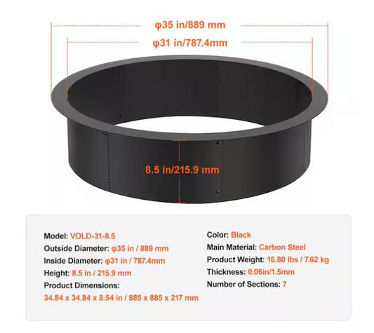 Fire Pit Ring, 35 in. Outer/31 in. Inner Dia, 10 in Height Fire Pit Insert, Heavy Duty Carbon Steel Liner