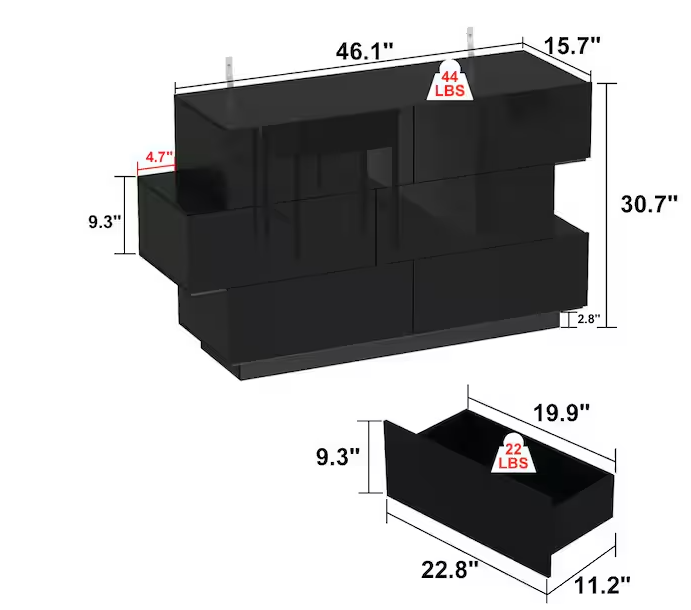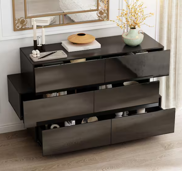 15.7 in. D x 30.7 in. H High Gloss Black Wood 6-Drawer 46.1 in. W Chest of Drawers Storage Cabinet Modern Style