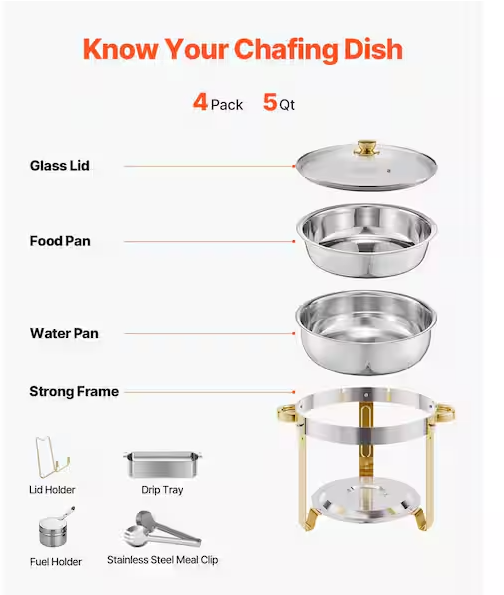 Chafing Dish Buffet Set, 5 qt. 4-Pack, Stainless Steel Chafer with Pans and Glass Lid, Round Catering Warmer with Fuel