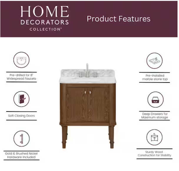 Collette 30 in. Single Sink Cinnamon Oak Bath Vanity with White Carrara Marble Top (Assembled)